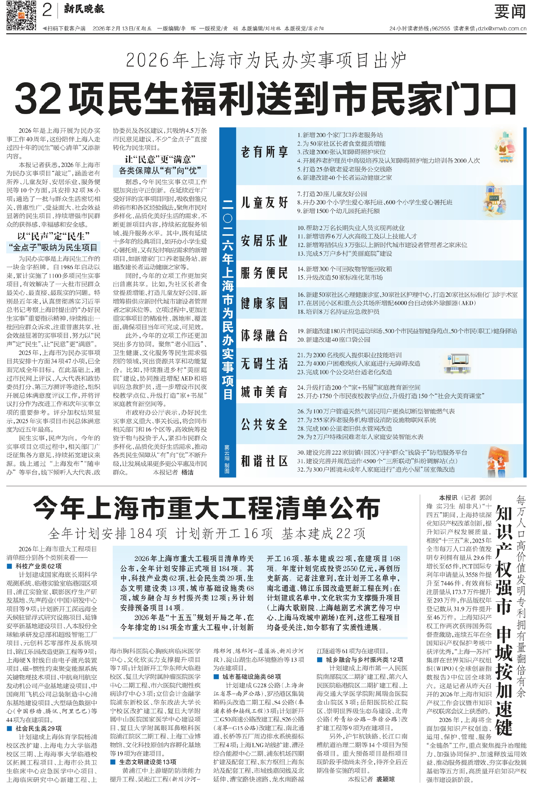 本报记者获悉,2026年上海市为民办实事项目“敲定”,涵盖老有所养、儿童友好、安居乐业、服务便民等10个方面,共安排32项38小项;遴选了一批与群众生活密切相关、普惠性广、受益面大、社会效益显著的民生项目,持续增强市民群众的获得感、幸福感和安全感。