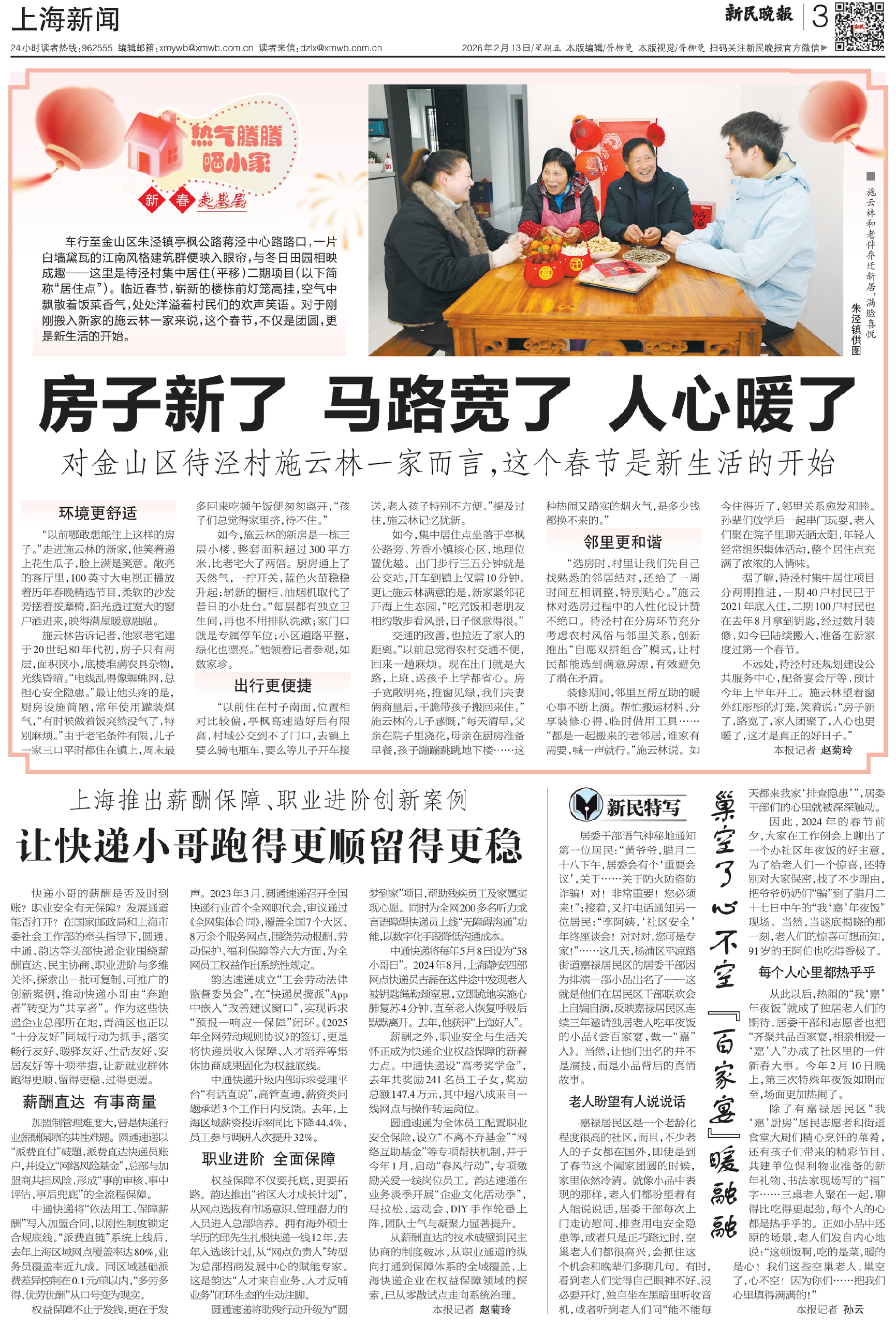不远处,待泾村还规划建设公共服务中心,配备宴会厅等,预计今年上半年开工。施云林望着窗外红彤彤的灯笼,笑着说:“房子新了,路宽了,家人团聚了,人心也更暖了,这才是真正的好日子。”