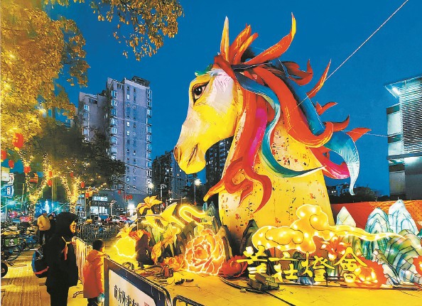 2026莘庄灯会“马啸长空”灯组璀璨夺目,流畅的线条与变幻的光影营造出生肖马年主题年味,吸引路人驻足打卡 杨建正 摄