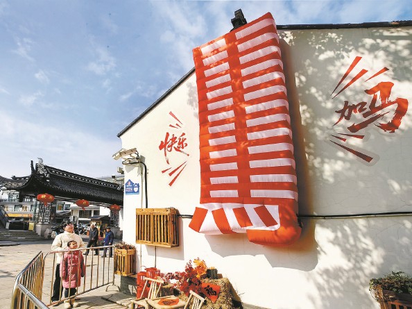 朱家角古镇大街上,传统的剪纸与汉字文化有机融合,充满美好寓意的巨型马字装置艺术作品吸引路人眼球 杨建正 摄