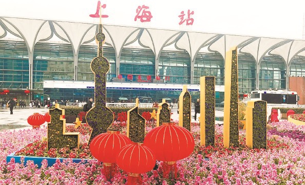上海站南广场上,上海地标建筑造型融合新年元素,为南来北往的旅客带来喜悦的心情 本报记者 刘歆 摄