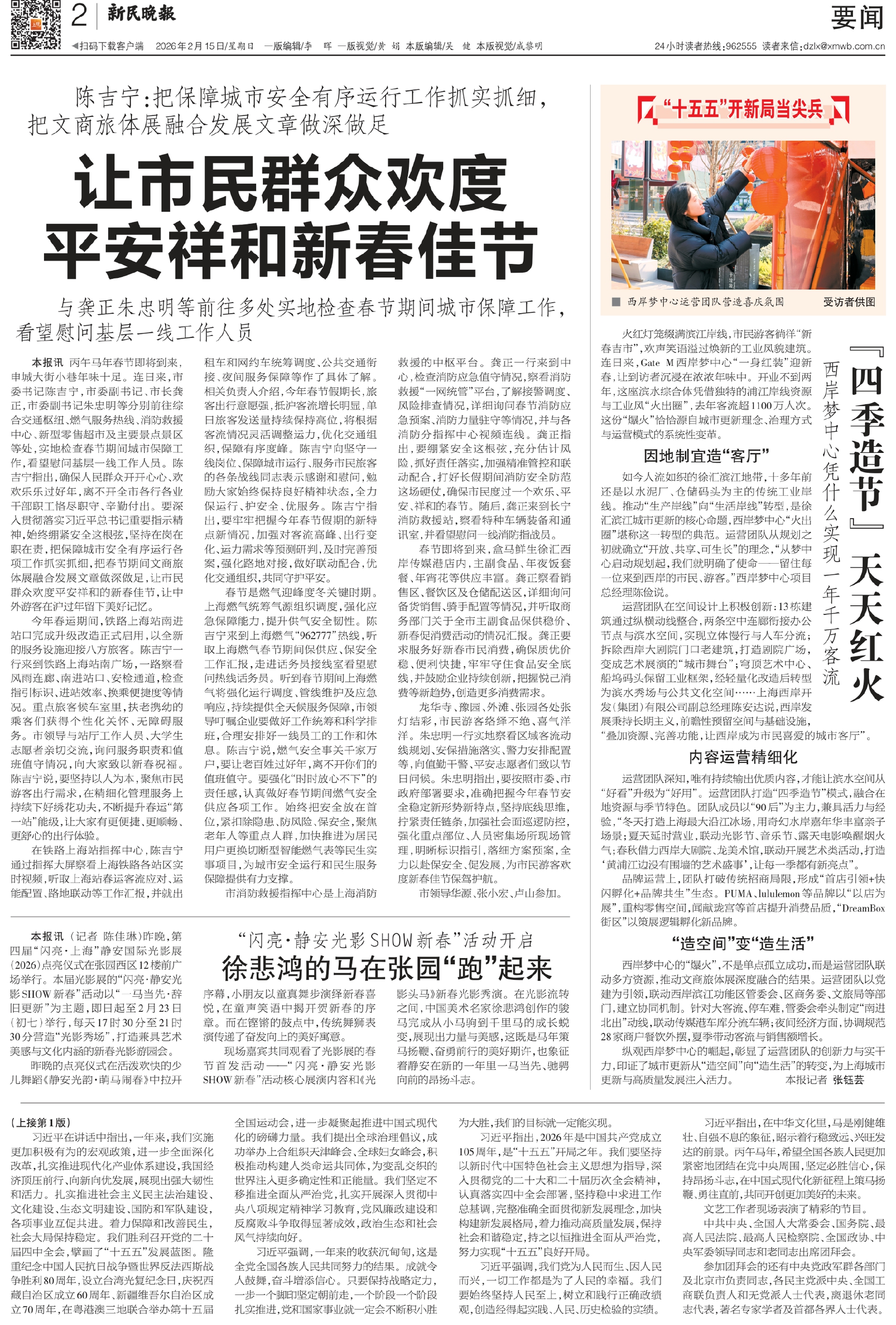 本报讯 丙午马年春节即将到来,申城大街小巷年味十足。连日来,市委书记陈吉宁,市委副书记、市长龚正,市委副书记朱忠明等分别前往综合交通枢纽、燃气服务热线、消防救援中心、新型零售超市及主要景点景区等处,实地检查春节期间城市保障工作,看望慰问基层一线工作人员。陈吉宁指出,确保人民群众开开心心、欢欢乐乐过好年,离不开全市各行各业干部职工恪尽职守、辛勤付出。要深入贯彻落实习近平总书记重要指示精神,始终绷紧安全这根弦,坚持在岗在职在责,把保障城市安全有序运行各项工作抓实抓细,把春节期间文商旅体展融合发展文章做深做足,让市民群众欢度平安祥和的新春佳节,让中外游客在沪过年留下美好记忆。
