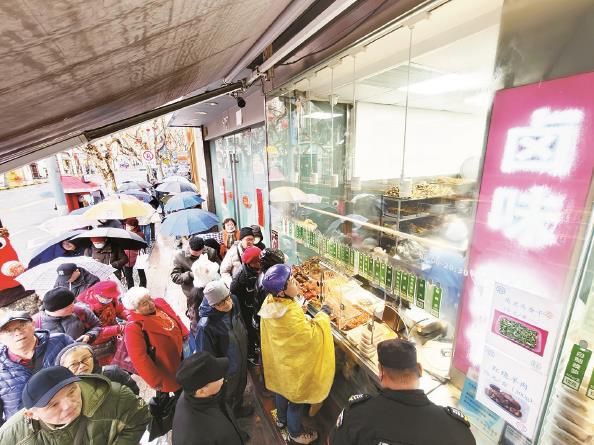 今天早晨,虽下着小雨,沪上老字号依旧人气火爆。淮海中路光明邨大酒家门前,为年夜饭购买卤味熟菜的市民排队超过百米,最早的凌晨四时就来等待开门采买。