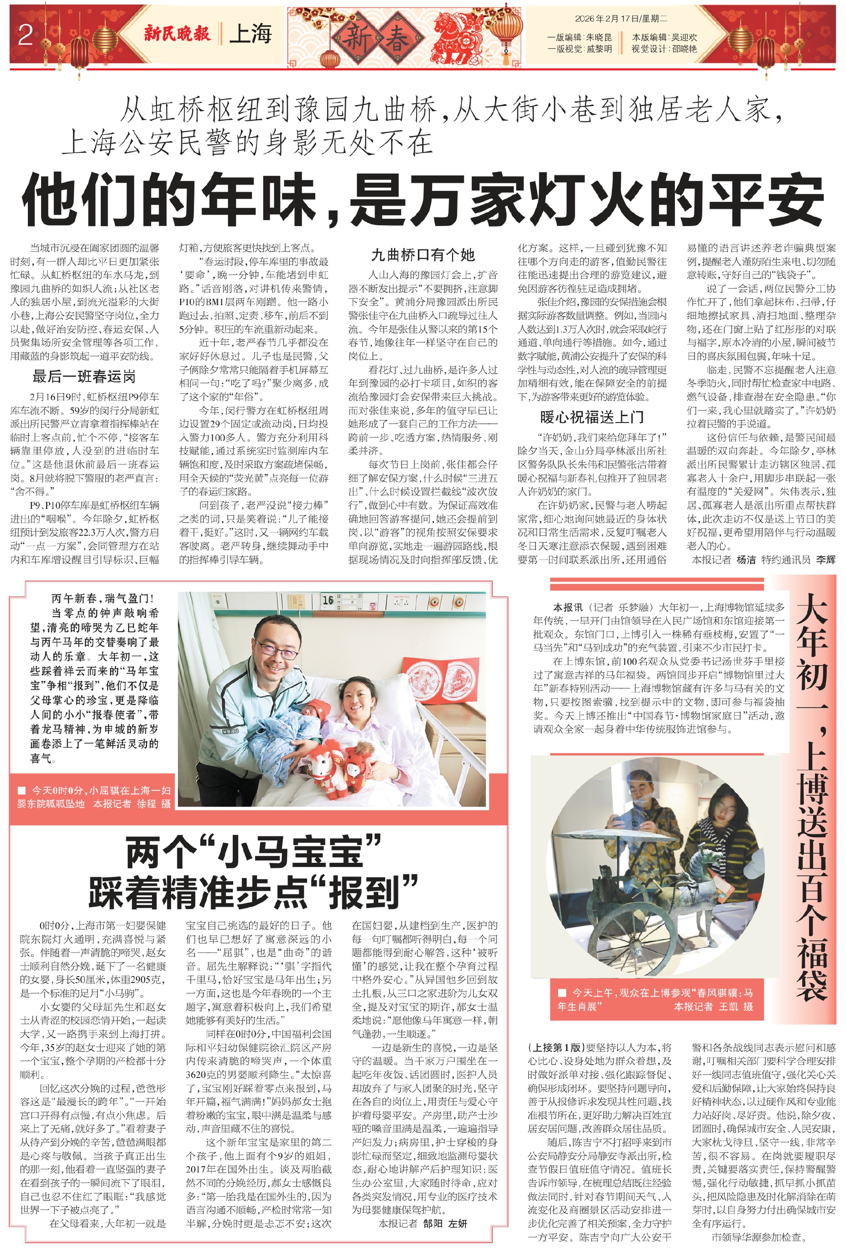 当城市沉浸在阖家团圆的温馨时刻,有一群人却比平日更加紧张忙碌。从虹桥枢纽的车水马龙,到豫园九曲桥的如织人流;从社区老人的独居小屋,到流光溢彩的大街小巷,上海公安民警坚守岗位,全力以赴,做好治安防控、春运安保、人员聚集场所安全管理等各项工作,用藏蓝的身影筑起一道平安防线。