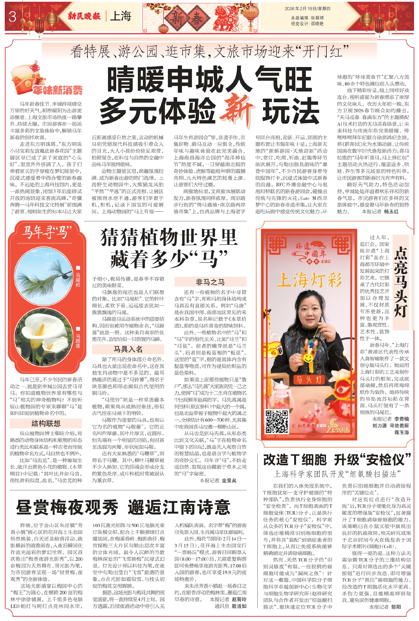 晴好天气助力,特色活动加持,申城处处洋溢着欢乐祥和的新春气息。市民游客们在多样的文旅体验中,感受着马年新春的独特魅力。 本报记者 杨玉红