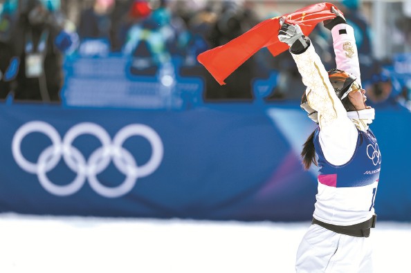 徐梦桃举国旗庆祝 特约记者 钱俊 摄