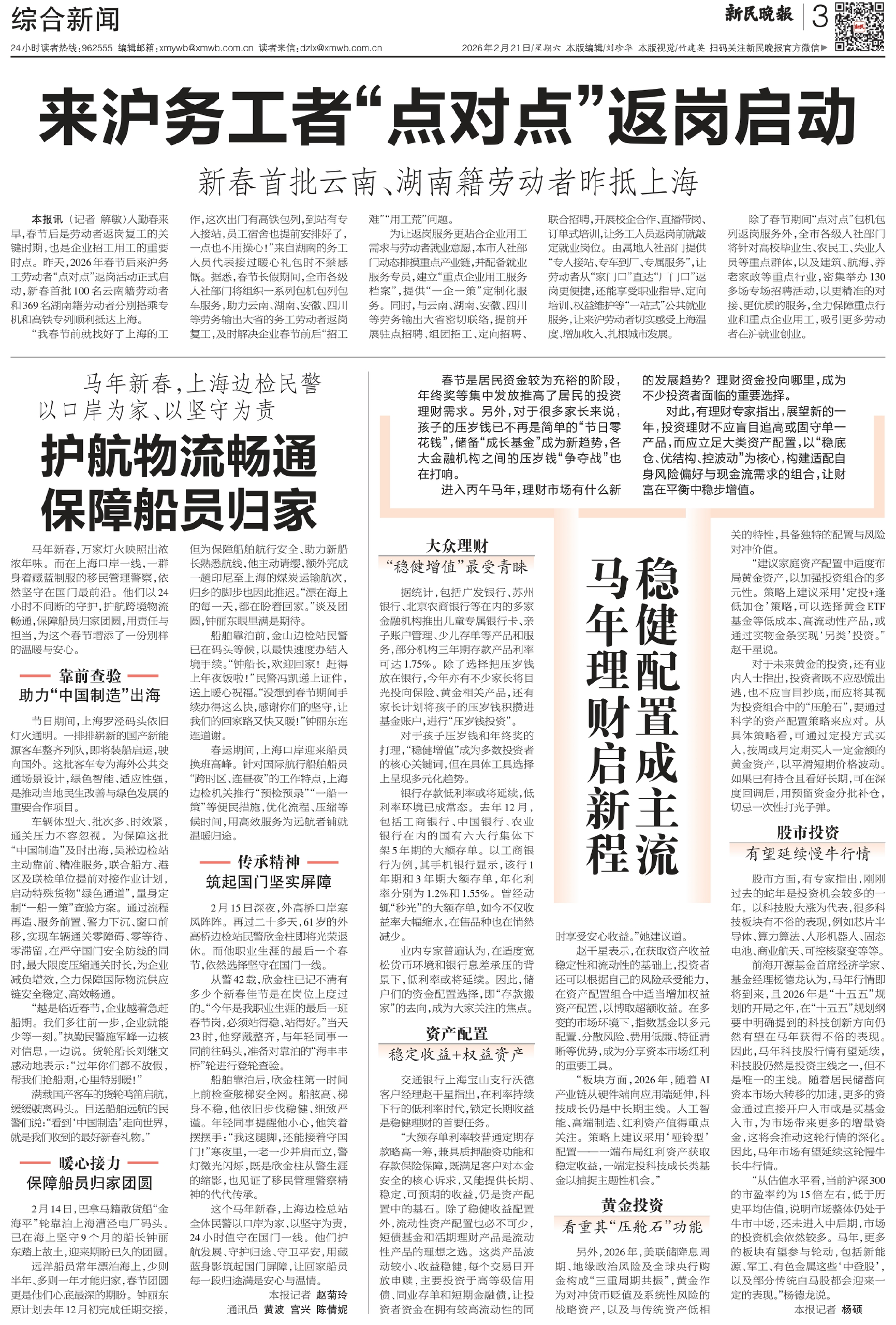 本报讯 (记者 解敏)人勤春来早,春节后是劳动者返岗复工的关键时期,也是企业招工用工的重要时点。昨天,2026年春节后来沪务工劳动者“点对点”返岗活动正式启动,新春首批100名云南籍劳动者和369名湖南籍劳动者分别搭乘专机和高铁专列顺利抵达上海。