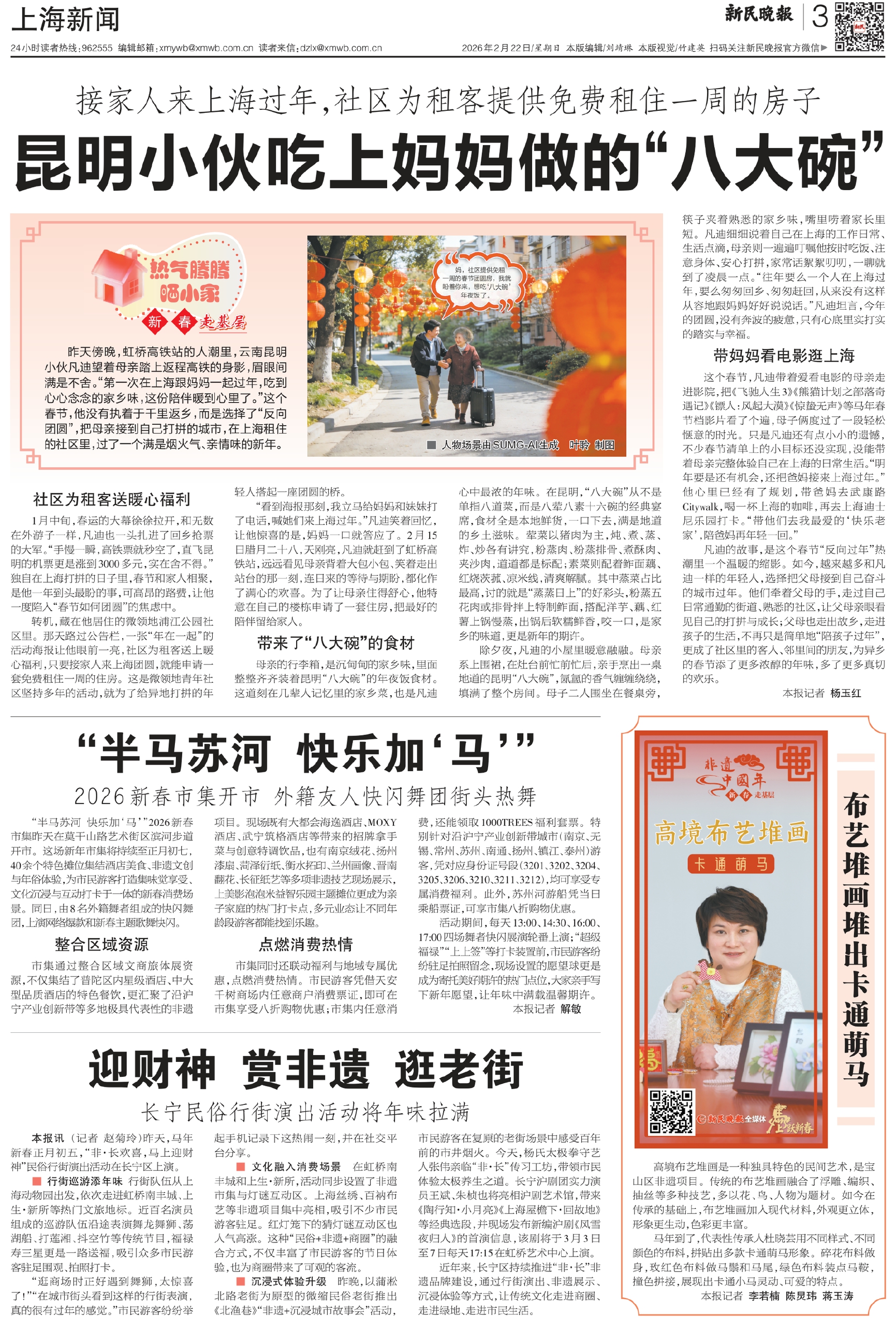 “看到海报那刻,我立马给妈妈和妹妹打了电话,喊她们来上海过年。”凡迪笑着回忆,让他惊喜的是,妈妈一口就答应了。2月15日腊月二十八,天刚亮,凡迪就赶到了虹桥高铁站,远远看见母亲背着大包小包、笑着走出站台的那一刻,连日来的等待与期盼,都化作了满心的欢喜。为了让母亲住得舒心,他特意在自己的楼栋申请了一套住房,把最好的陪伴留给家人。