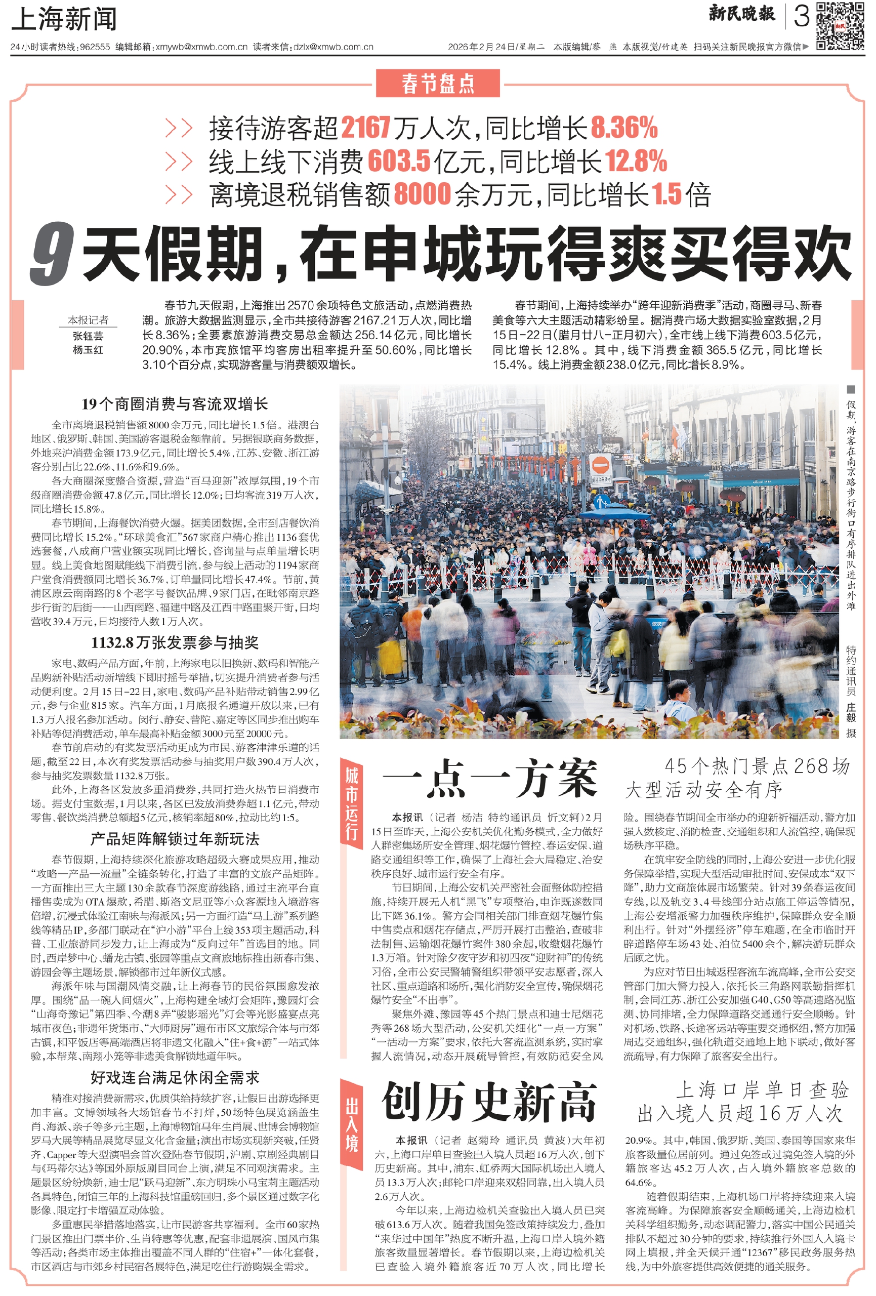 春节九天假期,上海推出2570余项特色文旅活动,点燃消费热潮。旅游大数据监测显示,全市共接待游客2167.21万人次,同比增长8.36%;全要素旅游消费交易总金额达256.14亿元,同比增长20.90%,本市宾旅馆平均客房出租率提升至50.60%,同比增长3.10个百分点,实现游客量与消费额双增长。