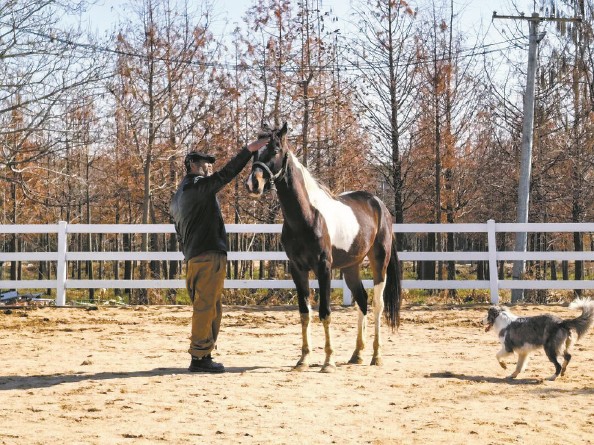 采访当天,记者走进马场,只见陈军正在专注地驯马,两只边牧在马儿身后撒欢。不远处,陈桂芳和朱金华并肩坐在枯黄的草地上,目光温柔地追随着马儿与儿子的身影。阳光洒在大地上,温暖着一家老小。“走”“慢”“吁”……陈军的口令时而轻柔时而有力,抬手拍拍马颈、摸摸马头,还会低声说些鼓励的话。“马儿和人一样,得表扬奖励,才会越来越听话。”陈桂芳笑着说,陈家几代养马人都真心爱马,对马的习性了如指掌。