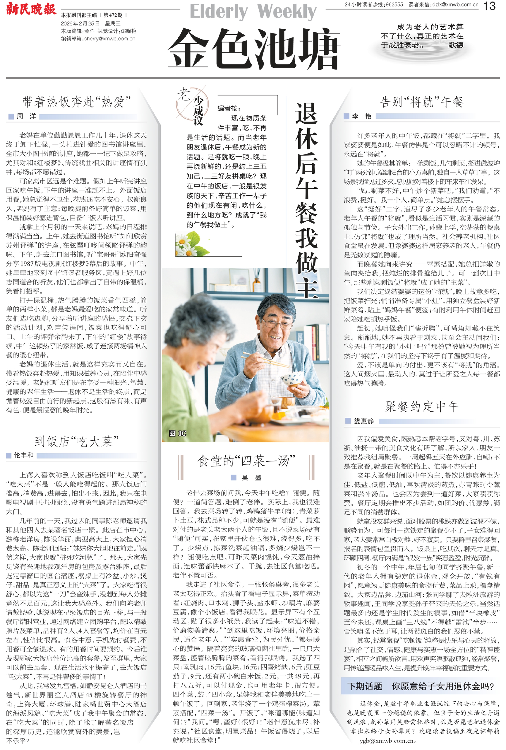 现在物质条件丰富,吃,不再是生活的话题。而当老年朋友退休后,午餐成为新的话题。是将就吃一顿,晚上再烧新鲜的,还是约上三五知己,二三好友拼桌吃?现在中午的饭店,一般是银发族的天下,辛苦工作一辈子的他们现在有闲,吃什么,到什么地方吃?成就了“我的午餐我做主”。