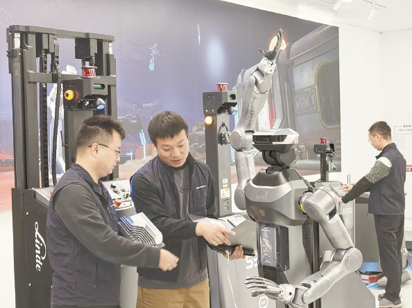 调试机器人 马年新春,浦东金桥锦绣申江园区上海仙工智能的研发人员已全部返岗。今天上午,工程师们对搭载了新型“机器人大脑”的人形机器人进行集中调试。 本报记者 刘歆 摄影报道