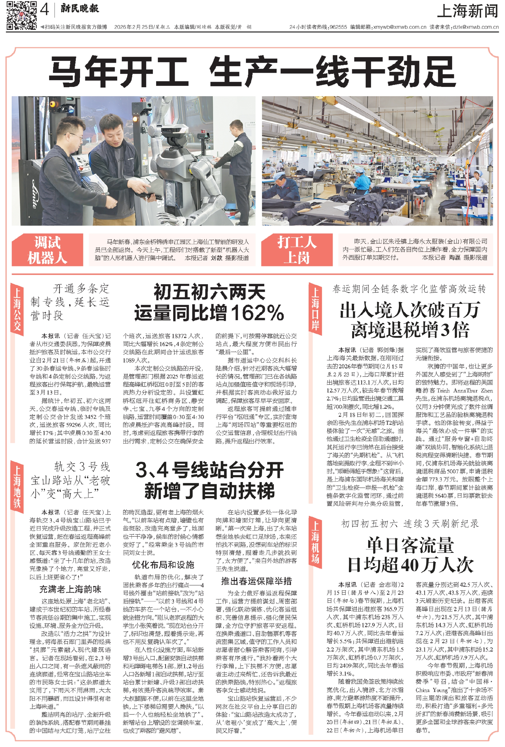单日客流量日均超40万人次 出入境人次破百万 离境退税增3倍 初五初六两天运量同比增162% 3、4号线站台分开 新增了自动扶梯 马年开工 生产一线干劲足