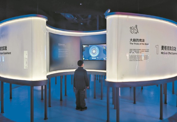 小朋友在“神奇的我”展区体验视觉错觉 本报记者 陶磊 摄