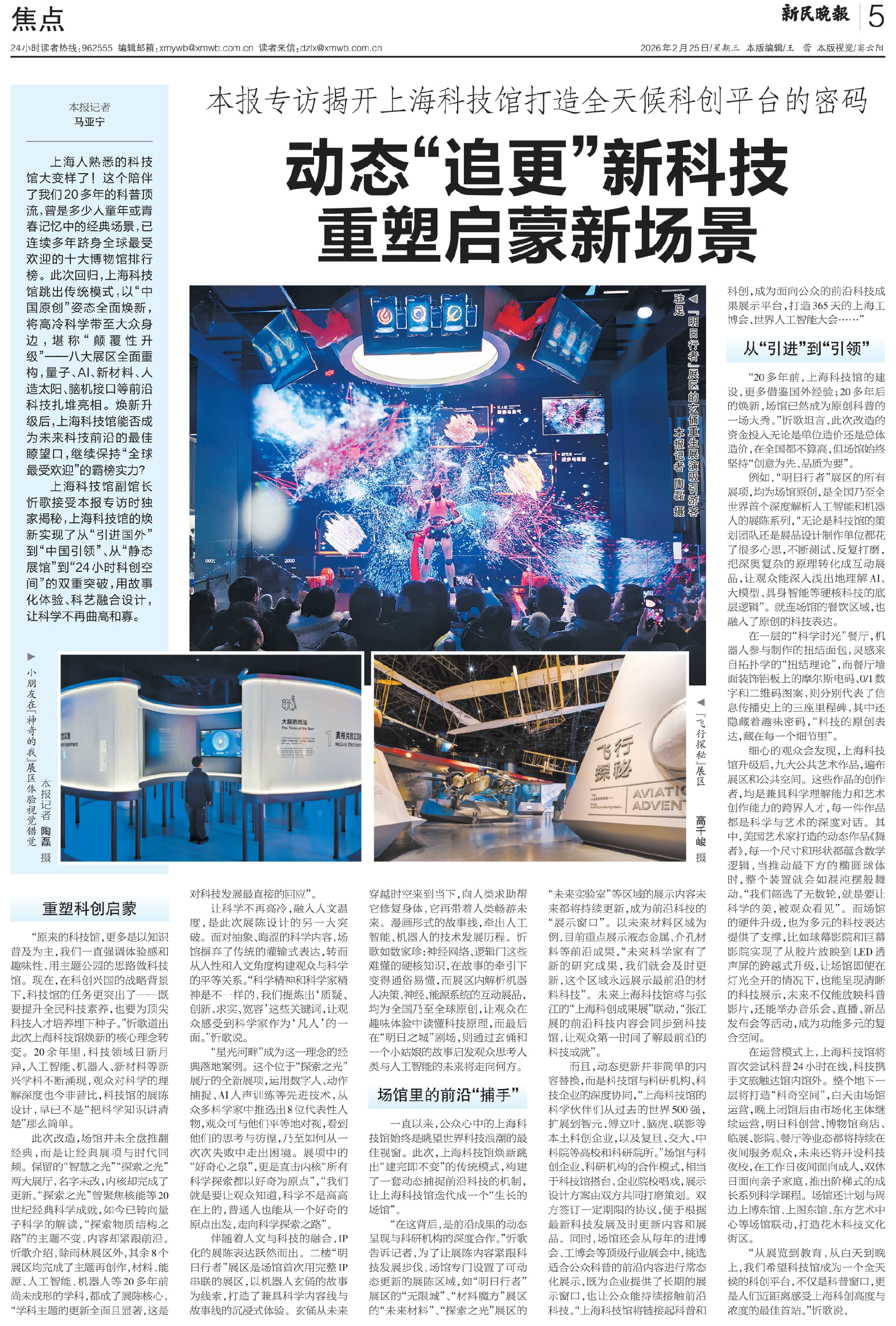 上海科技馆副馆长忻歌接受本报专访时独家揭秘,上海科技馆的焕新实现了从“引进国外”到“中国引领”、从“静态展馆”到“24小时科创空间”的双重突破,用故事化体验、科艺融合设计,让科学不再曲高和寡。