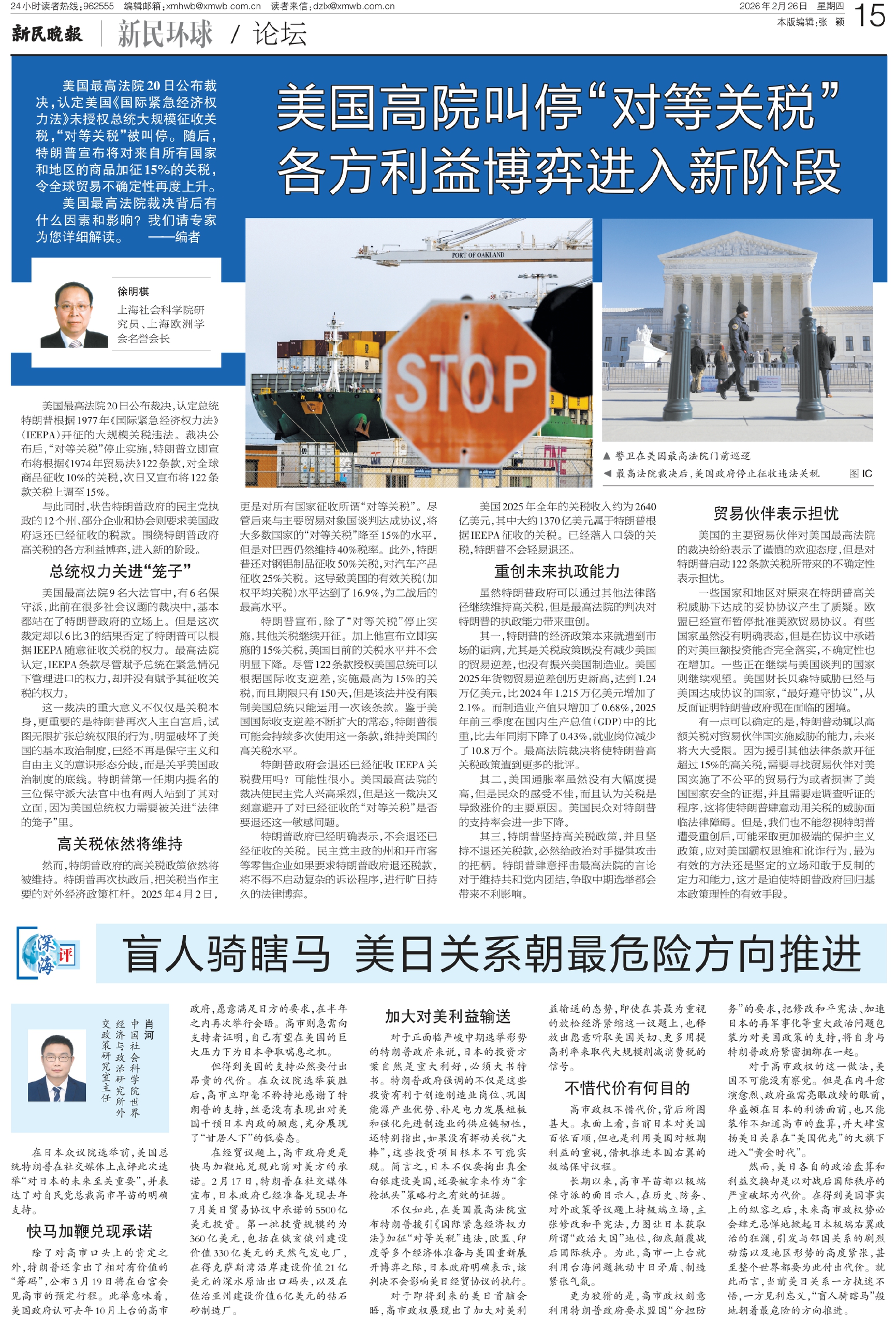 美国最高法院20日公布裁决,认定总统特朗普根据1977年《国际紧急经济权力法》(IEEPA)开征的大规模关税违法。裁决公布后,“对等关税”停止实施,特朗普立即宣布将根据《1974年贸易法》122条款,对全球商品征收10%的关税,次日又宣布将122条款关税上调至15%。