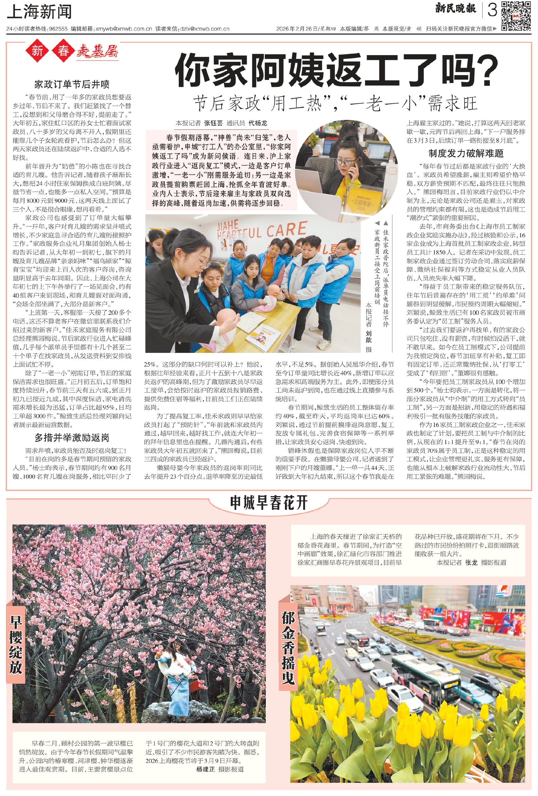 春节假期落幕,“神兽”尚未“归笼”,老人亟需看护,申城“打工人”的办公室里,“你家阿姨返工了吗”成为新问候语。连日来,沪上家政行业进入“返岗复工”模式,一边是客户订单激增,“一老一小”刚需服务迫切;另一边是家政员提前购票赶回上海,抢抓全年首波好单。业内人士表示,节后迎来雇主与家政员双向选择的高峰,随着返岗加速,供需将逐步回稳。