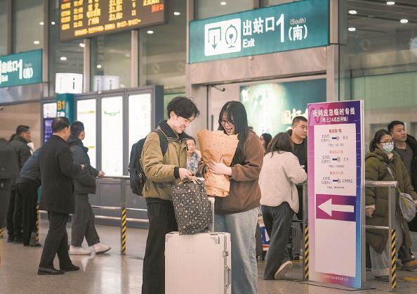深夜的虹桥火车站,年味与心愿交织。来自河南的王一煊在上海做销售工作,昨晚特意带着鲜花来虹桥火车站接女友,刚来上海一年的他谈及新年心愿,眼里满是期待:“新一年希望好好打拼,多攒点钱,买一辆新能源车方便代步,带着女友在上海安稳扎根。”在车库等候网约车的赵女士拖着行李,手里的年货也格外显眼,“这是哥哥送的腌制鱼,有差不多10斤,应该能吃很久”。她笑着告诉记者:“家里的味道吃着暖心,也更有动力。”简单几句话,藏着对家乡的爱,也透着对新年的希冀。