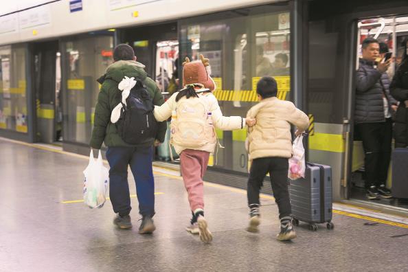 春节返程高峰,虹桥火车站成为抵沪客流最集中的枢纽。后半夜,到达口客流持续不断,为对接夜间大客流,虹桥枢纽交通保障全面升级。返程高峰期间,轨交2、10、17号线增设定点加班车,最晚末班车延长至次日0:20,精准衔接虹桥站夜间到达客流。地铁虹桥火车站站值班站长陈蕾穿梭在站台与车厢之间,耐心招呼着旅客:“大家抓紧时间上车,别错过末班车啦!”虹桥火车站西交通中心同步开行临时接驳线,直达市区、金山以及嘉定等区域,发车间隔紧凑,公交车驾驶员反复招呼乘客尽量往车厢内部挪动,为后面的旅客腾出空间,让更多返程旅客能顺利上车,不用在寒风中久等。