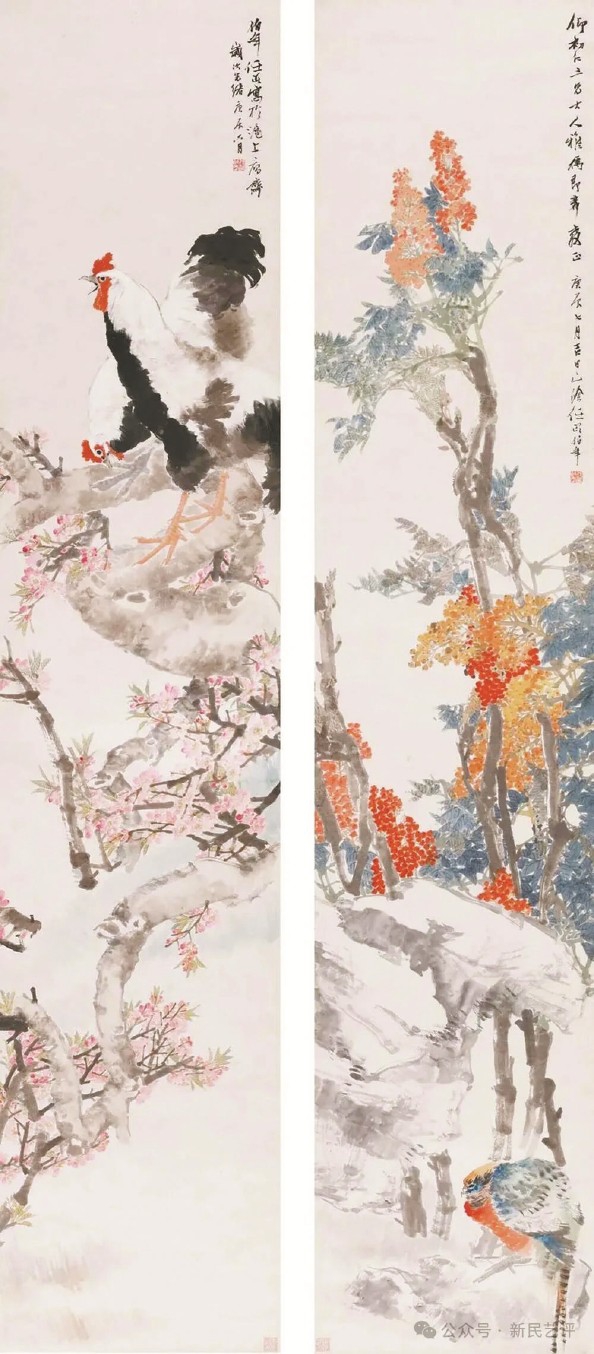 清 任伯年《桃花双鸡图》与《天竹锦鸡图》