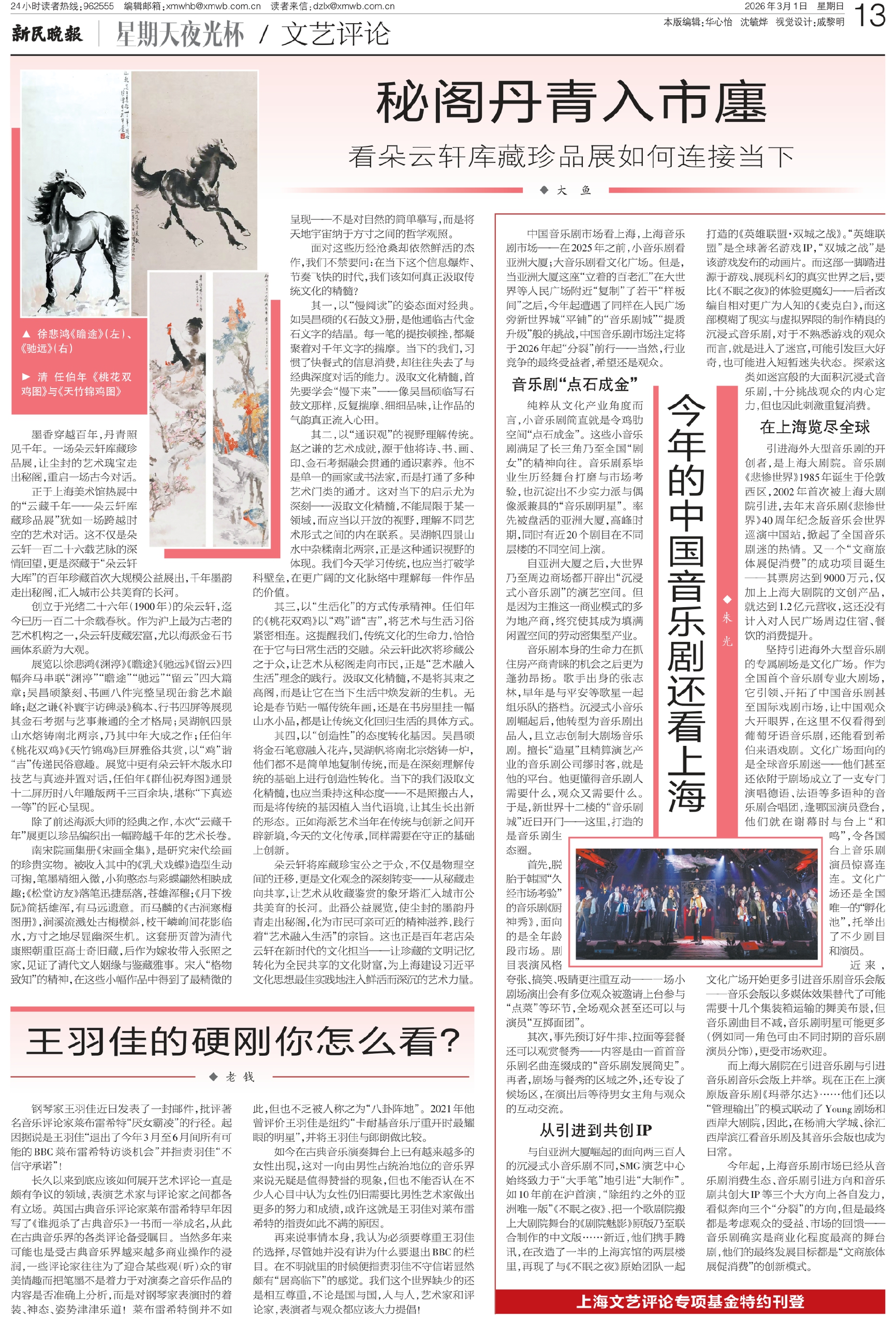 其三,以“生活化”的方式传承精神。任伯年的《桃花双鸡》以“鸡”谐“吉”,将艺术与生活习俗紧密相连。这提醒我们,传统文化的生命力,恰恰在于它与日常生活的交融。朵云轩此次将珍藏公之于众,让艺术从秘阁走向市民,正是“艺术融入生活”理念的践行。汲取文化精髓,不是将其束之高阁,而是让它在当下生活中焕发新的生机。无论是春节贴一幅传统年画,还是在书房里挂一幅山水小品,都是让传统文化回归生活的具体方式。