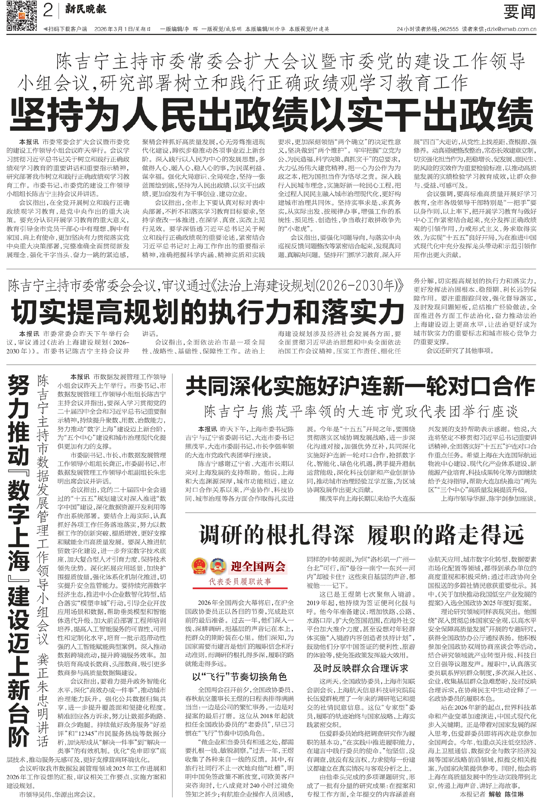 会议指出,全市上下要认真对标对表中央部署,不折不扣落实学习教育目标要求,坚持学查改一体推进,在深学、真查、实改上见行见效。要学深悟透习近平总书记关于树立和践行正确政绩观的重要论述,紧密结合习近平总书记对上海工作作出的重要指示精神,准确把握科学内涵、精神实质和实践要求,更加深刻领悟“两个确立”的决定性意义,坚决做到“两个维护”。牢牢把握“立党为公、为民造福、科学决策、真抓实干”的总要求,大力弘扬伟大建党精神,把一心为公作为为政之本,把为国担当作为恪尽之责。深入践行人民城市理念,实施好新一轮民心工程,把全过程人民民主融入城市治理现代化,更好构建城市治理共同体。坚持实事求是、求真务实,从实际出发、按规律办事,增强工作的系统性、预见性、创造性,争当敢打敢拼敢争先的“小老虎”。