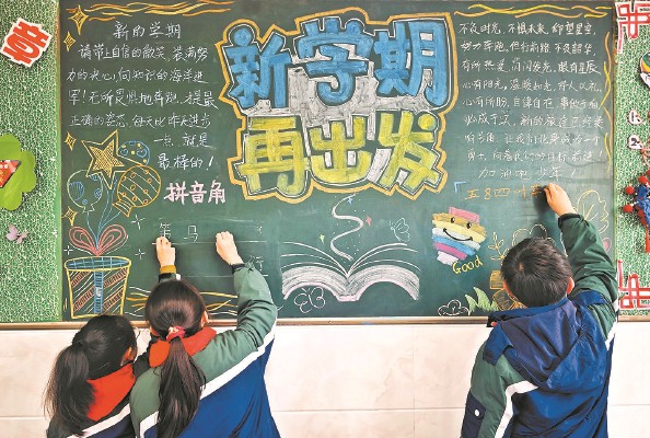 新学期即将开学,金山区第一实验小学的校园又重新热闹起来,返校的孩子们绘制展望新学期的主题板报,教材分发工作也有序进行。 随着寒假步入尾声,全市各校开学准备已就绪,静待学子归来,开启新学期征程。 本报记者 陶磊 摄影报道