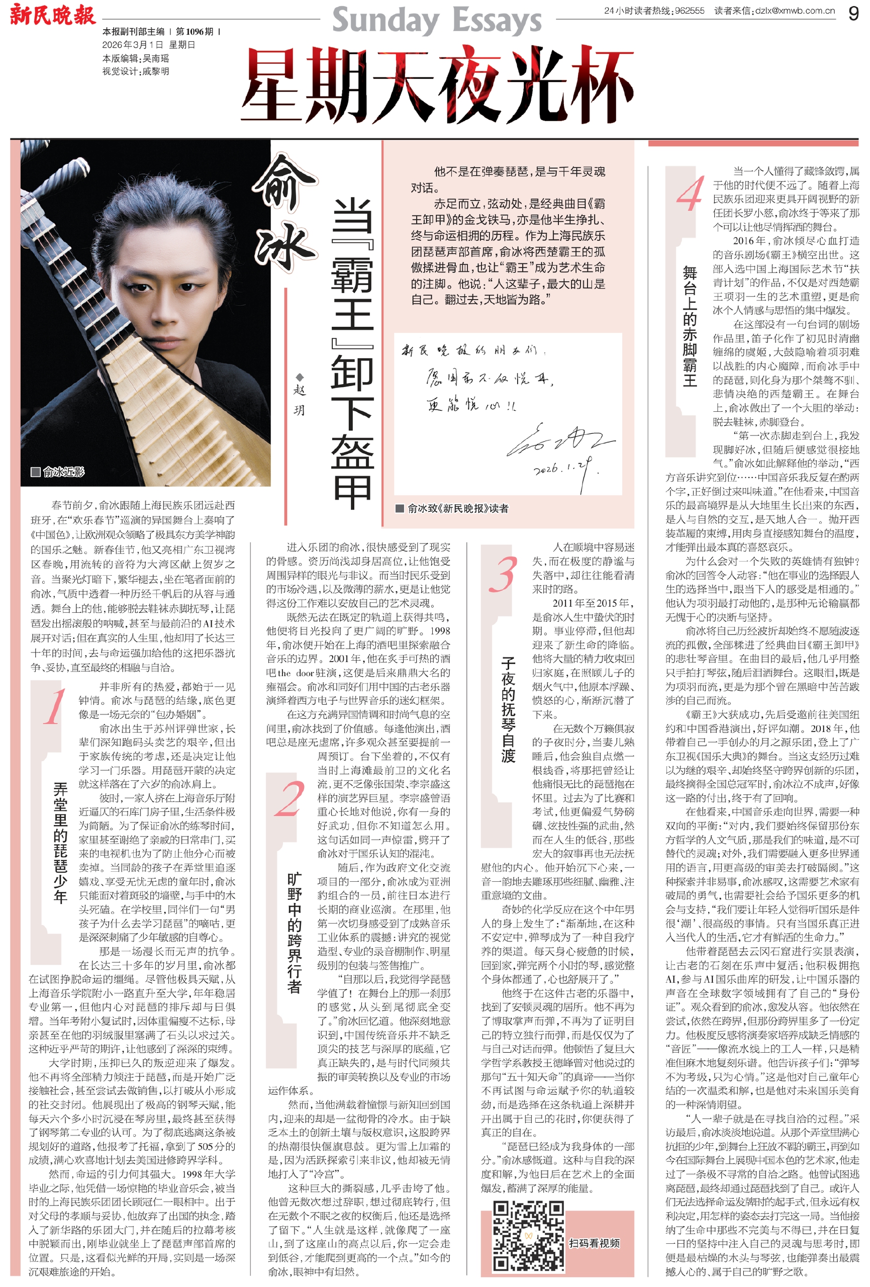 在他看来,中国音乐走向世界,需要一种双向的平衡:“对内,我们要始终保留那份东方哲学的人文气质,那是我们的味道,是不可替代的灵魂;对外,我们需要融入更多世界通用的语言,用更高级的审美去打破隔阂。”这种探索并非易事,俞冰感叹,这需要艺术家有破局的勇气,也需要社会给予国乐更多的机会与支持,“我们要让年轻人觉得听国乐是件很‘潮’、很高级的事情。只有当国乐真正进入当代人的生活,它才有鲜活的生命力。”