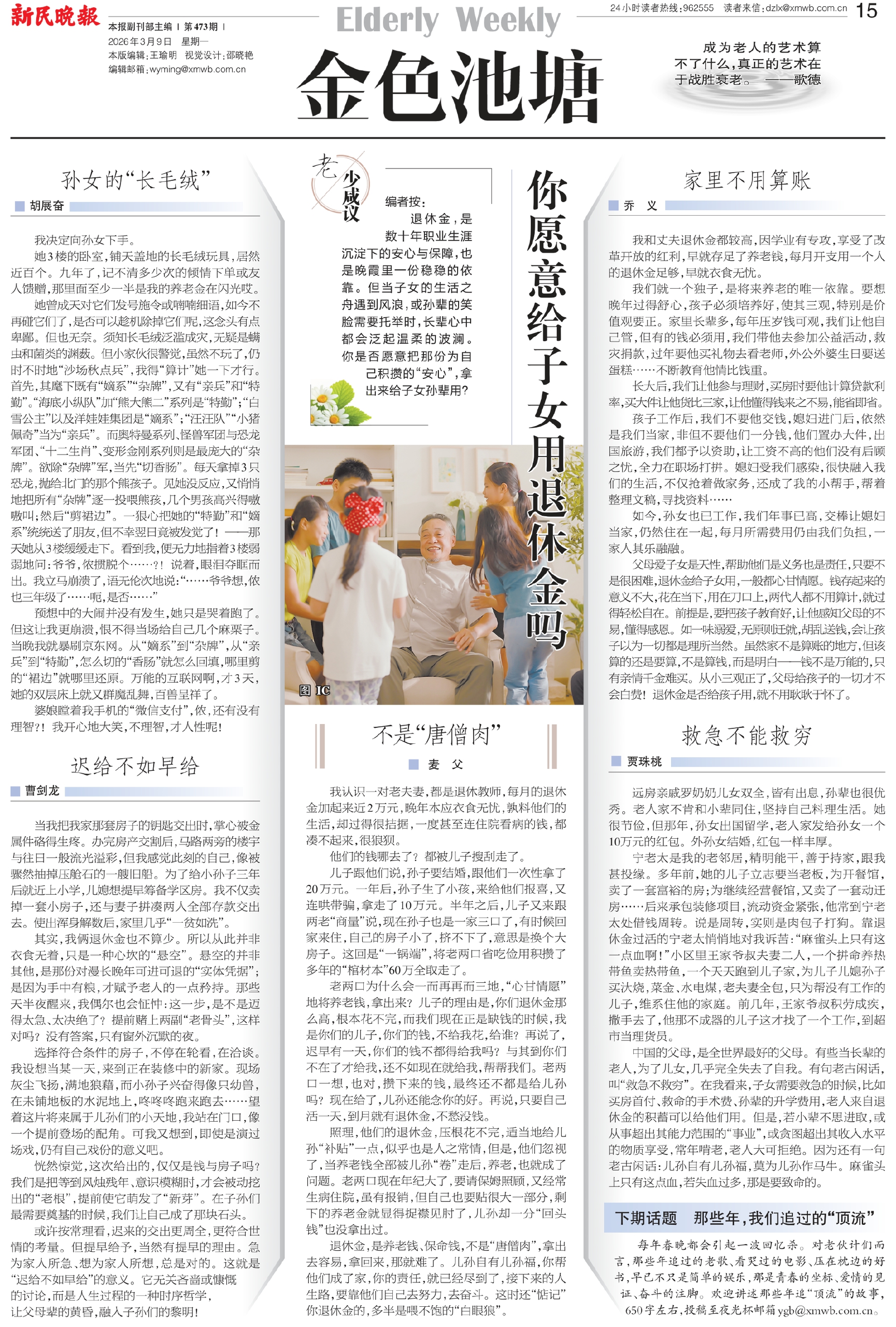 中国的父母,是全世界最好的父母。有些当长辈的老人,为了儿女,几乎完全失去了自我。有句老古闲话,叫“救急不救穷”。在我看来,子女需要救急的时候,比如买房首付、救命的手术费、孙辈的升学费用,老人来自退休金的积蓄可以给他们用。但是,若小辈不思进取,或从事超出其能力范围的“事业”,或贪图超出其收入水平的物质享受,常年啃老,老人大可拒绝。因为还有一句老古闲话:儿孙自有儿孙福,莫为儿孙作马牛。麻雀头上只有这点血,若失血过多,那是要致命的。