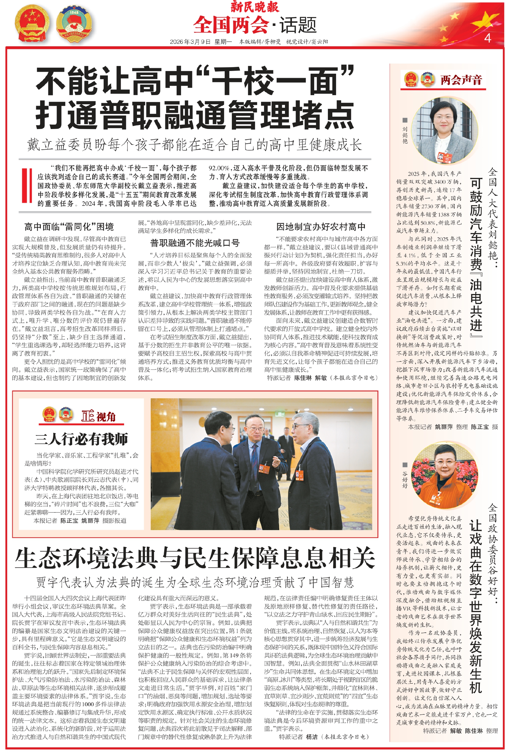 面向未来,戴立益建议创建适合数智时代要求的开放式高中学校。建立健全校内外协同育人体系,推进技术赋能,使科技教育成为核心内容。“高中教育普及意味着系统性变化,必须以自我革命精神促进可持续发展,培育先进文化,让每个孩子都能在适合自己的高中里健康成长。”特派记者 陈佳琳 解敏(本报北京今日电)