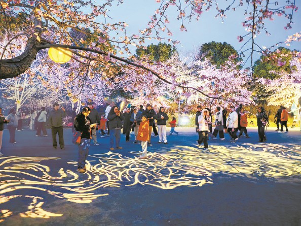 图为地面上的图案投影与泛光灯点缀的樱花融为一体 杨建正 摄影报道