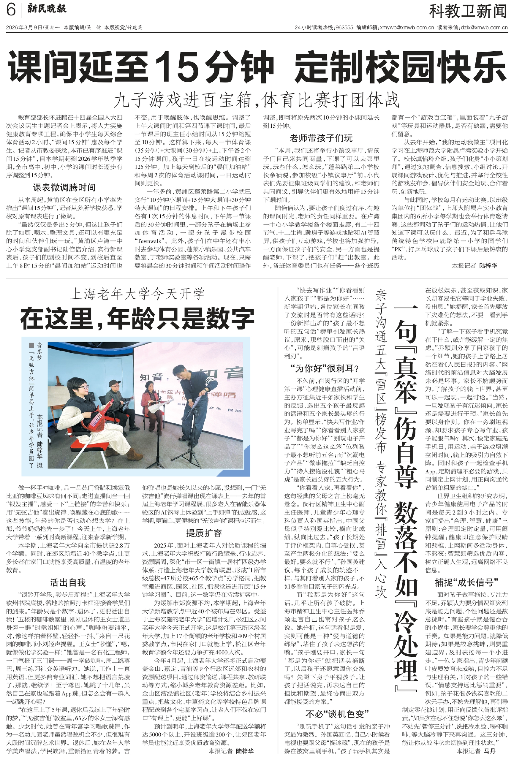 教育部部长怀进鹏在十四届全国人大四次会议民生主题记者会上表示,将大力实施健康教育专项工程,确保中小学生每天综合体育活动2小时、“课间15分钟”惠及每个学生。记者从市教委获悉,本市已有序推进“课间15分钟”,自本学期起到2026学年秋季学期,全市高中、初中、小学的课间时长逐步有序调整到15分钟。