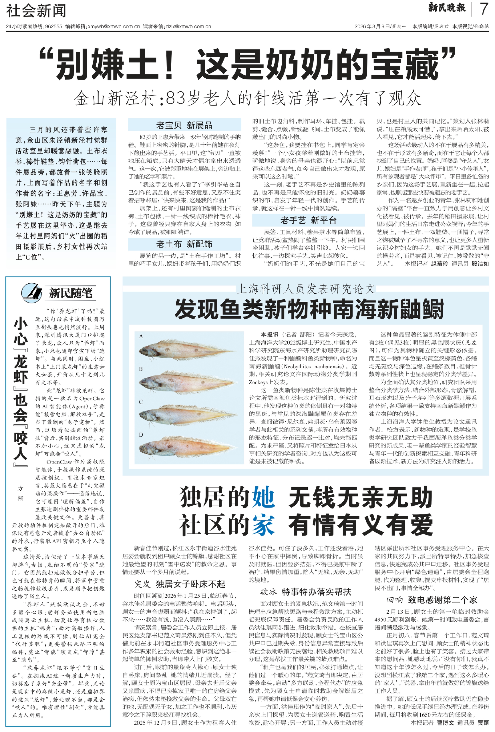 三月的风还带着些许寒意,金山区朱泾镇新泾村党群活动室里却暖意融融。土布衣衫、棒针鞋垫、钩针荷包……每件展品旁,都放着一张笑脸照片,上面写着作品的名字和创作者的名字:王惠芳、许品宝、张阿妹……昨天下午,主题为“别嫌土!这是奶奶的宝藏”的手艺展在这里举办,这是继去年让村里阿妈们“火”出圈的稻田摄影展后,乡村女性再次站上“C位”。