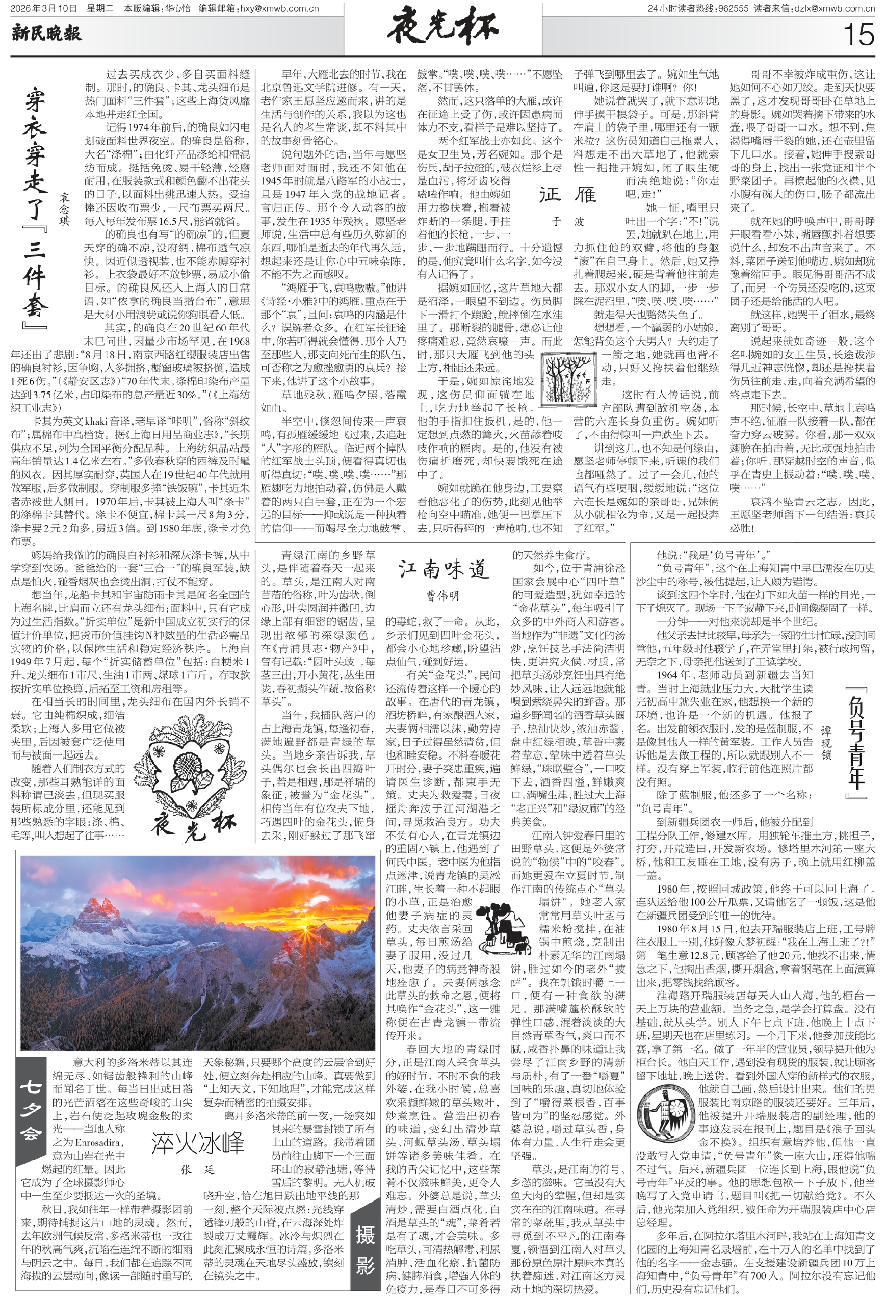 姆妈给我做的的确良白衬衫和深灰涤卡裤,从中学穿到农场。爸爸给的一套“三合一”的确良军装,缺点是怕火,碰香烟灰也会烫出洞,打仗不能穿。