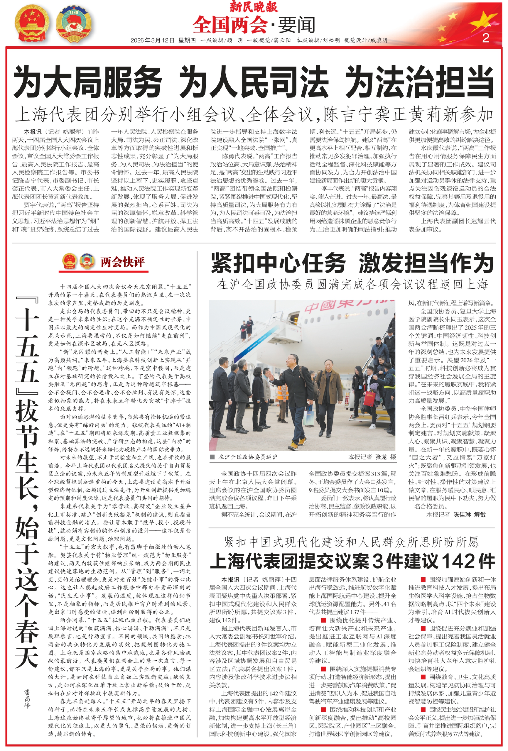 本报讯(记者 姚丽萍)前昨两天,十四届全国人大四次会议上海代表团分别举行小组会议、全体会议,审议全国人大常委会工作报告、最高人民法院工作报告、最高人民检察院工作报告等。市委书记陈吉宁代表,市委副书记、市长龚正代表,市人大常委会主任、上海代表团团长黄莉新代表参加。