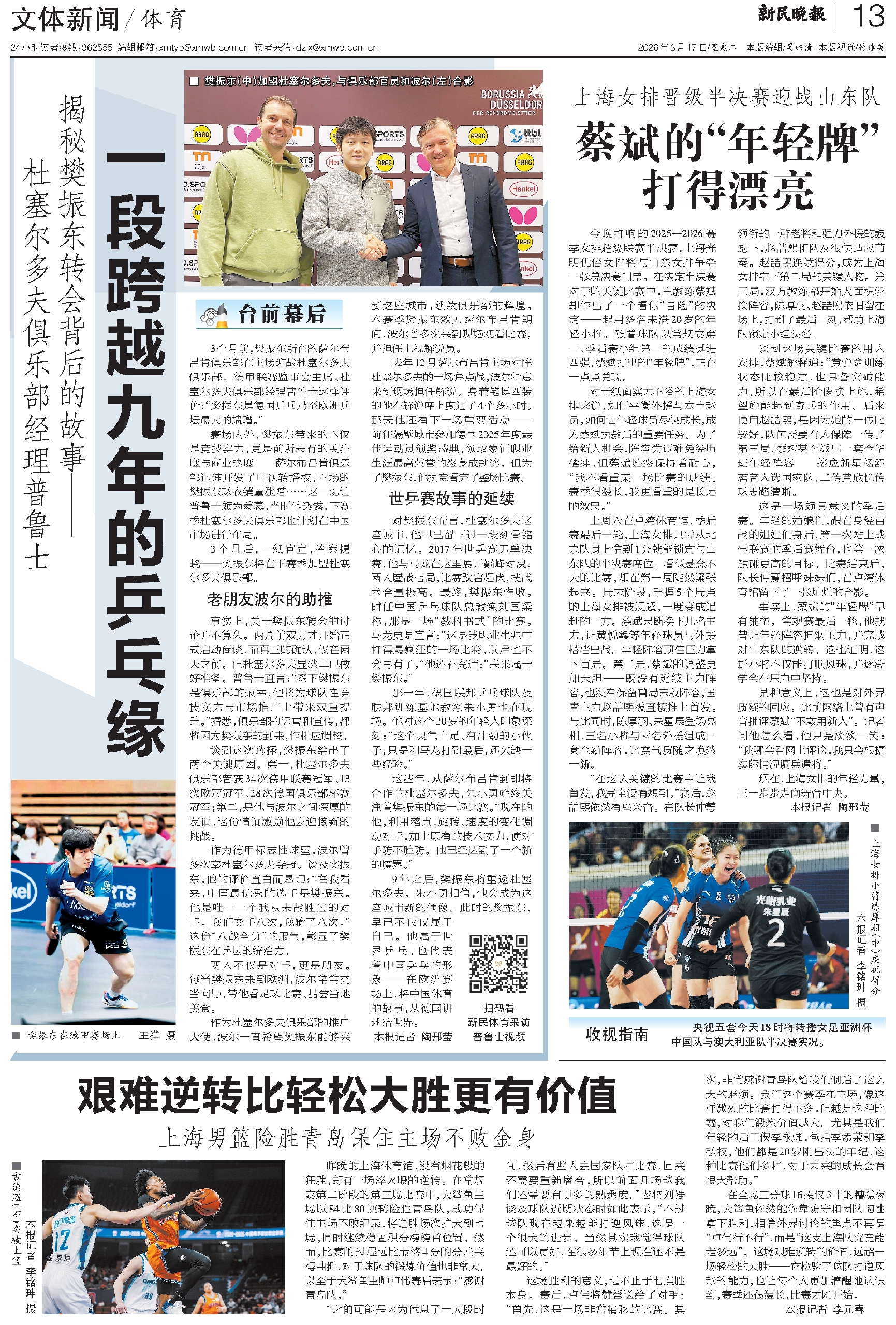 9年之后,樊振东将重返杜塞尔多夫。朱小勇相信,他会成为这座城市新的偶像。此时的樊振东,早已不仅仅属于自己。他属于世界乒乓,也代表着中国乒乓的形象——在欧洲赛场上,将中国体育的故事,从德国讲述给世界。