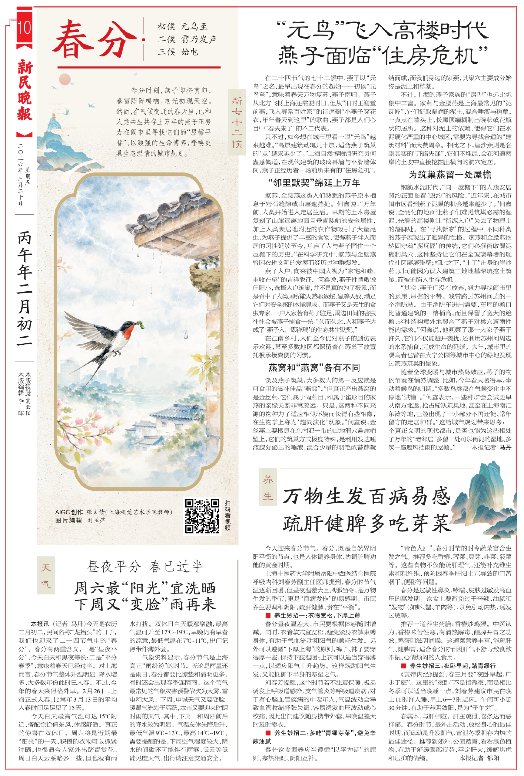 在二十四节气的七十二候中,燕子以“元鸟”之名,最早出现在春分的起始——初候“元鸟至”,意味着春天万物复苏,燕子南归。燕子从北方飞抵上海还需要时日,但从“旧时王谢堂前燕,飞入寻常百姓家”的诗词到“小燕子穿花衣,年年春天到这里”的歌曲,燕子都是人们心目中“春天来了”的不二代表。