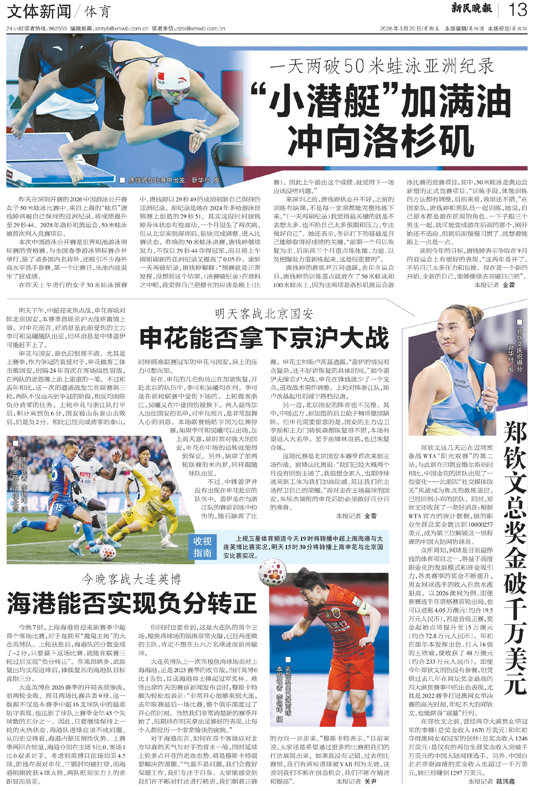 昨天在深圳开赛的2026中国游泳公开赛女子50米蛙泳比赛中,来自上海的“蛙后”唐钱婷两破自己保持的亚洲纪录,将成绩提升至29秒44。2028年洛杉矶奥运会,50米蛙泳被首次列入竞赛项目。