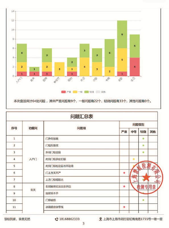 去年5月,倪阿姨在嘉定区南翔镇购置一套精装现房,房屋面积约106平方米,总价546万元。倪阿姨坦言,之所以选择现房,是因为自己年过六旬,想省去装修的烦琐,盼着早日安心入住。6月18日交房当天,倪阿姨聘请专业验房机构上门查验,结果让人大跌眼镜。验房师出具的报告显示,房屋10个功能间共查出64处问题,其中严重问题9个、一般问题22个、轻微问题33个。