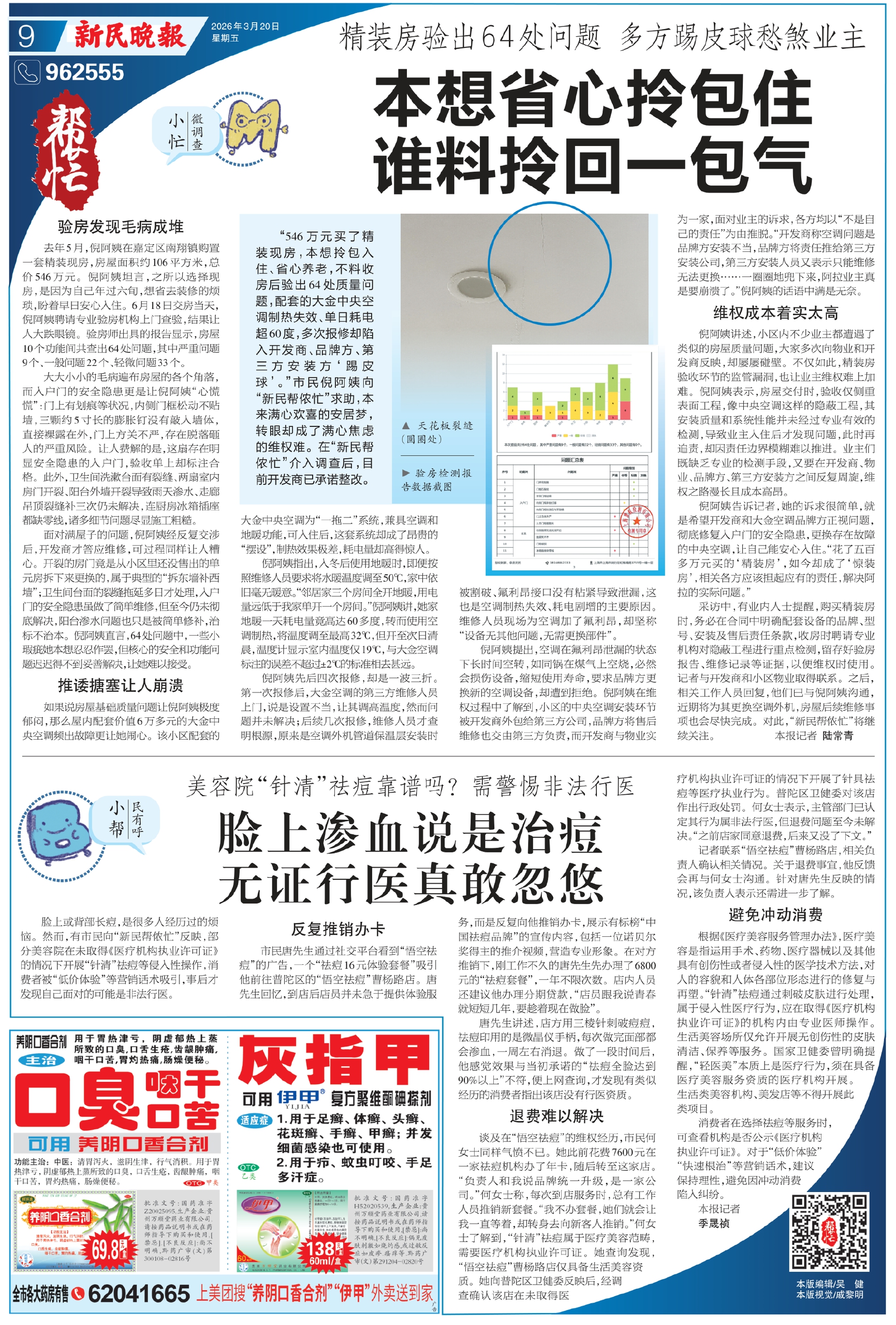 “546万元买了精装现房,本想拎包入住、省心养老,不料收房后验出64处质量问题,配套的大金中央空调制热失效、单日耗电超60度,多次报修却陷入开发商、品牌方、第三方安装方‘踢皮球’。”市民倪阿姨向“新民帮侬忙”求助,本来满心欢喜的安居梦,转眼却成了满心焦虑的维权难。在“新民帮侬忙”介入调查后,目前开发商已承诺整改。