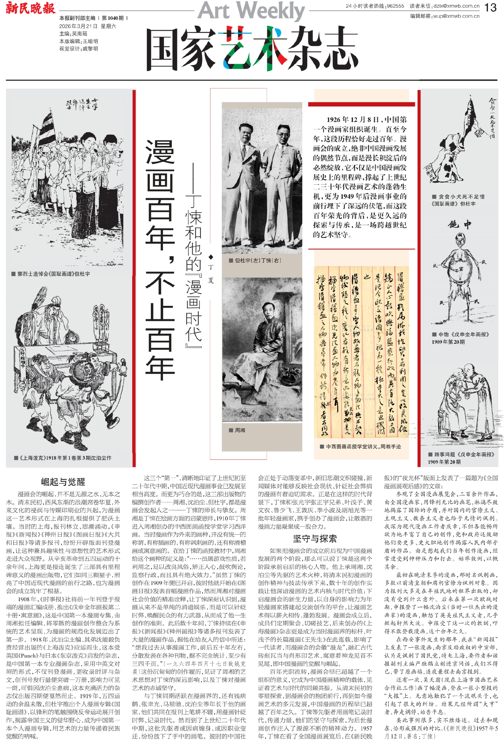 百年光阴流转,漫画会早已超越了一个组织的意义,它成为中国漫画精神的载体,见证着艺术与时代的同频共振。从清末民初的零星探索,到漫画会的抱团前行,再到如今漫画艺术的多元发展,中国漫画的历程早已超越了百年之久。丁悚等先驱者用画笔记录时代、传递力量,他们的坚守与探索,为后世漫画创作注入了源源不断的精神动力。1957年,丁悚在看了全国漫画展览后,在《新民晚报》的“夜光杯”版面上发表了一篇题为《全国漫画展观后感》的文章: