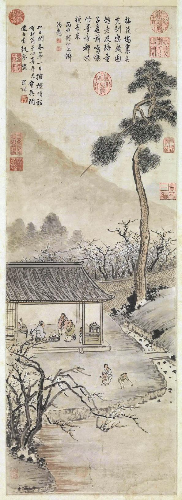 画上题诗“此日开春第一日,拥炉情话有村翁。予心喜与儿童异,闻道占年谷麦丰”,正是该画的点睛之笔。孩童之喜,是爆竹声中的天真嬉闹;老者之喜,是期盼五谷丰登的朴素心愿;画家之喜,则是在初春的庭院里,望见岁月安稳的从容。这般层次丰富的“喜”,让《开春报喜图》超越单纯写景,成为明代文人生活的一个缩影——他们既懂雅集闲情,亦通人间烟火,更怀扎根土地的生存智慧。