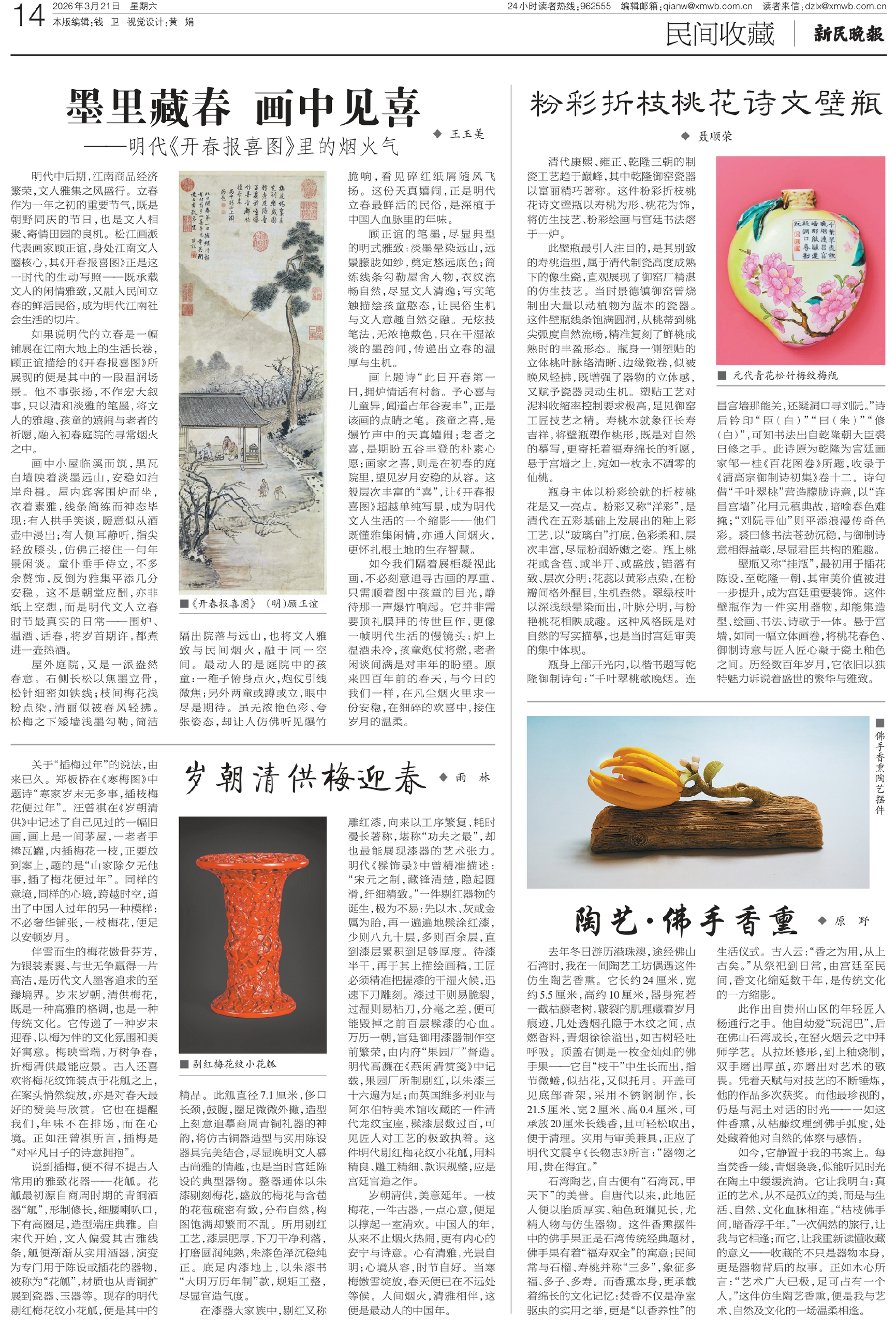 如今我们隔着展柜凝视此画,不必刻意追寻古画的厚重,只需顺着图中孩童的目光,静待那一声爆竹响起。它并非需要顶礼膜拜的传世巨作,更像一帧明代生活的慢镜头:炉上温酒未冷,孩童炮仗将燃,老者闲谈间满是对丰年的盼望。原来四百年前的春天,与今日的我们一样,在凡尘烟火里求一份安稳,在细碎的欢喜中,接住岁月的温柔。