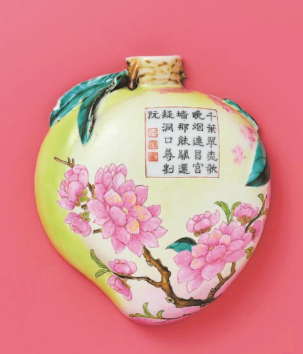 清代康熙、雍正、乾隆三朝的制瓷工艺趋于巅峰,其中乾隆御窑瓷器以富丽精巧著称。这件粉彩折枝桃花诗文壁瓶以寿桃为形、桃花为饰,将仿生技艺、粉彩绘画与宫廷书法熔于一炉。