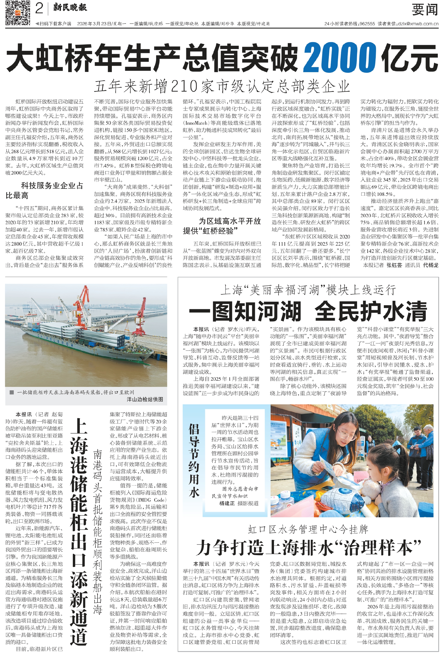 倡导节约用水 一图知河湖  全民护水清 力争打造上海排水“治理样本” 上海港储能柜出口添新通道 大虹桥年生产总值突破2000亿元