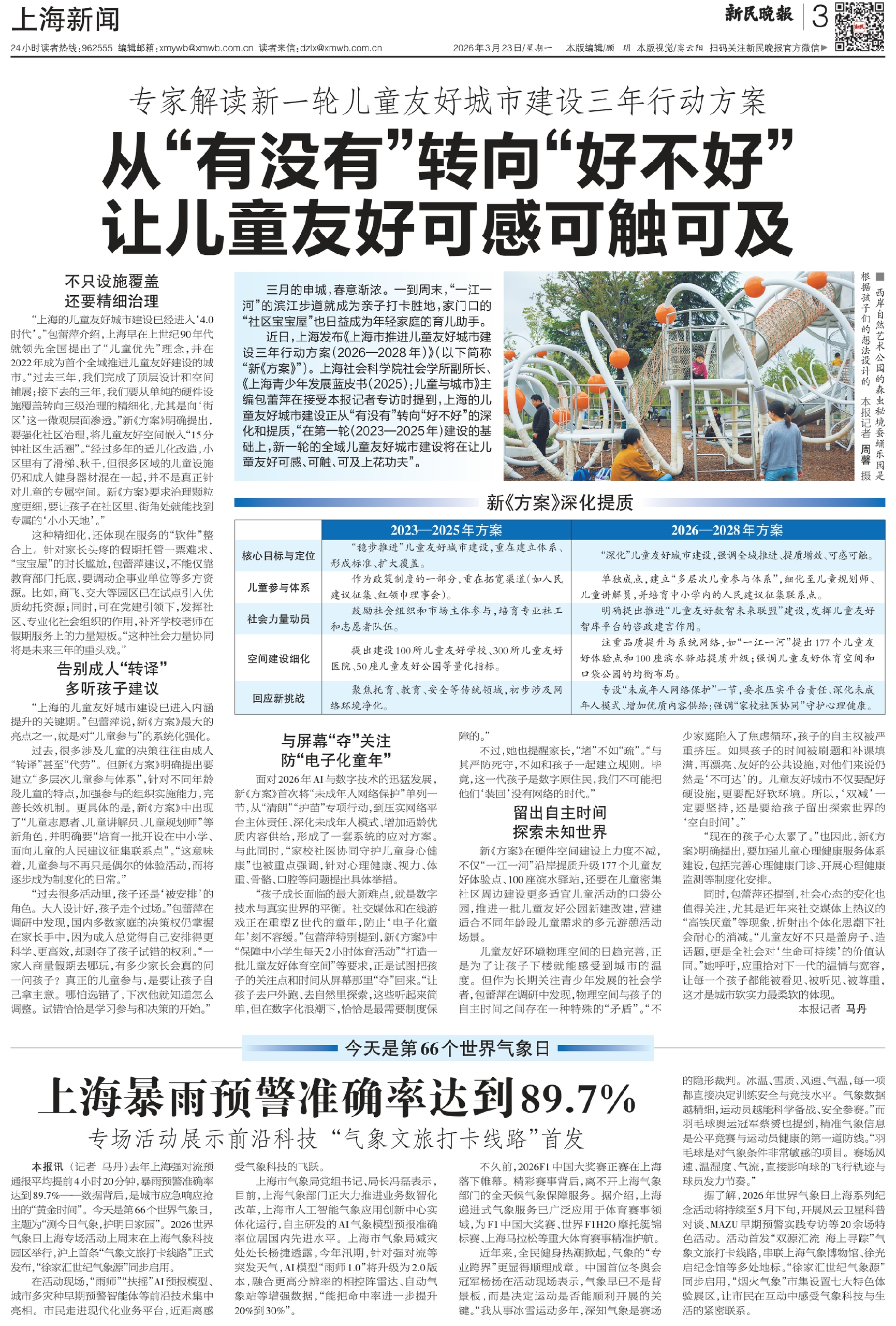 “上海的儿童友好城市建设已经进入‘4.0时代’。”包蕾萍介绍,上海早在上世纪90年代就领先全国提出了“儿童优先”理念,并在2022年成为首个全域推进儿童友好建设的城市。“过去三年,我们完成了顶层设计和空间铺展;接下去的三年,我们要从单纯的硬件设施覆盖转向三级治理的精细化,尤其是向‘街区’这一微观层面渗透。”新《方案》明确提出,要强化社区治理,将儿童友好空间嵌入“15分钟社区生活圈”。“经过多年的适儿化改造,小区里有了滑梯、秋千,但很多区域的儿童设施仍和成人健身器材混在一起,并不是真正针对儿童的专属空间。新《方案》要求治理颗粒度更细,要让孩子在社区里、街角处就能找到专属的‘小小天地’。”