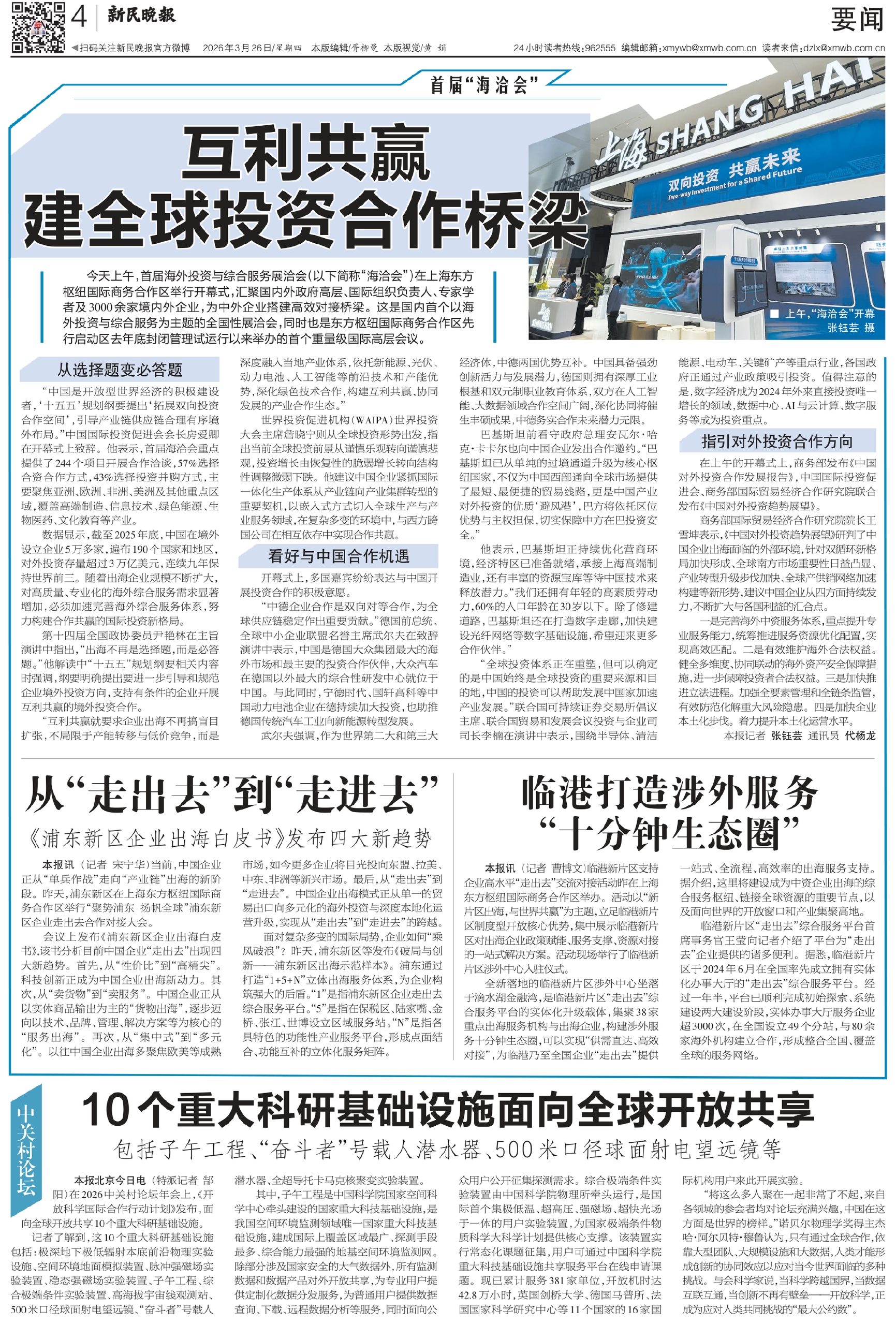 今天上午,首届海外投资与综合服务展洽会(以下简称“海洽会”)在上海东方枢纽国际商务合作区举行开幕式,汇聚国内外政府高层、国际组织负责人、专家学者及3000余家境内外企业,为中外企业搭建高效对接桥梁。这是国内首个以海外投资与综合服务为主题的全国性展洽会,同时也是东方枢纽国际商务合作区先行启动区去年底封闭管理试运行以来举办的首个重量级国际高层会议。