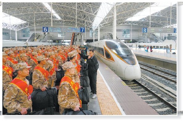 昨天下午,上海市2026年春季新兵起运工作正式启动。全市上半年所征新兵,分别从上海站、上海虹桥站、上海松江站同步启程,奔赴祖国各地军营,开启保家卫国的军旅生涯。 起运现场,身着崭新戎装、胸戴光荣红花、肩披入伍绶带的新兵们整齐列队、有序登车。 据悉,今年春季征兵工作启动以来,上海市严格落实征兵工作各项要求,确保为部队输送政治合格、素质过硬的优质兵员。本次新兵中,各级各类毕业生占比72.7%,兵员质量持续提升。 本报记者 张龙 摄影报道