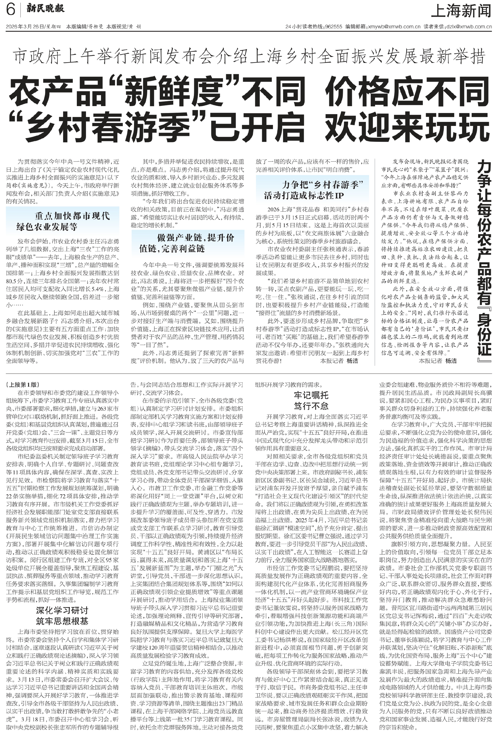 今年中央一号文件,强调要统筹发展科技农业、绿色农业、质量农业、品牌农业。对此,冯志勇说,上海将进一步把握好“四个农业”的关系,尤其要聚焦做强产业链、提升价值链、完善利益链等方面。