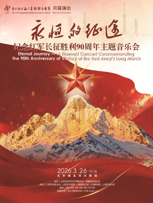 开幕演出《永恒的征途——纪念红军长征胜利90周年主题音乐会》由张国勇执棒,廖昌永、石倚洁等名家领衔,集结长征沿线七省艺术家与上海爱乐乐团、上海音乐学院交响乐团及合唱团、上海歌剧院合唱团、上海民族乐团等沪上顶尖乐团、合唱团,演绎《红旗颂》《长征组歌》《爱永在》《灯火里的中国》《我和我的祖国》等经典作品,以跨地域、跨院团、跨年代的艺术表达,让红色基因在新时代舞台上赓续。